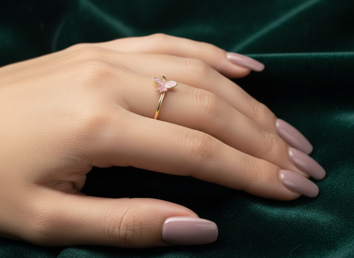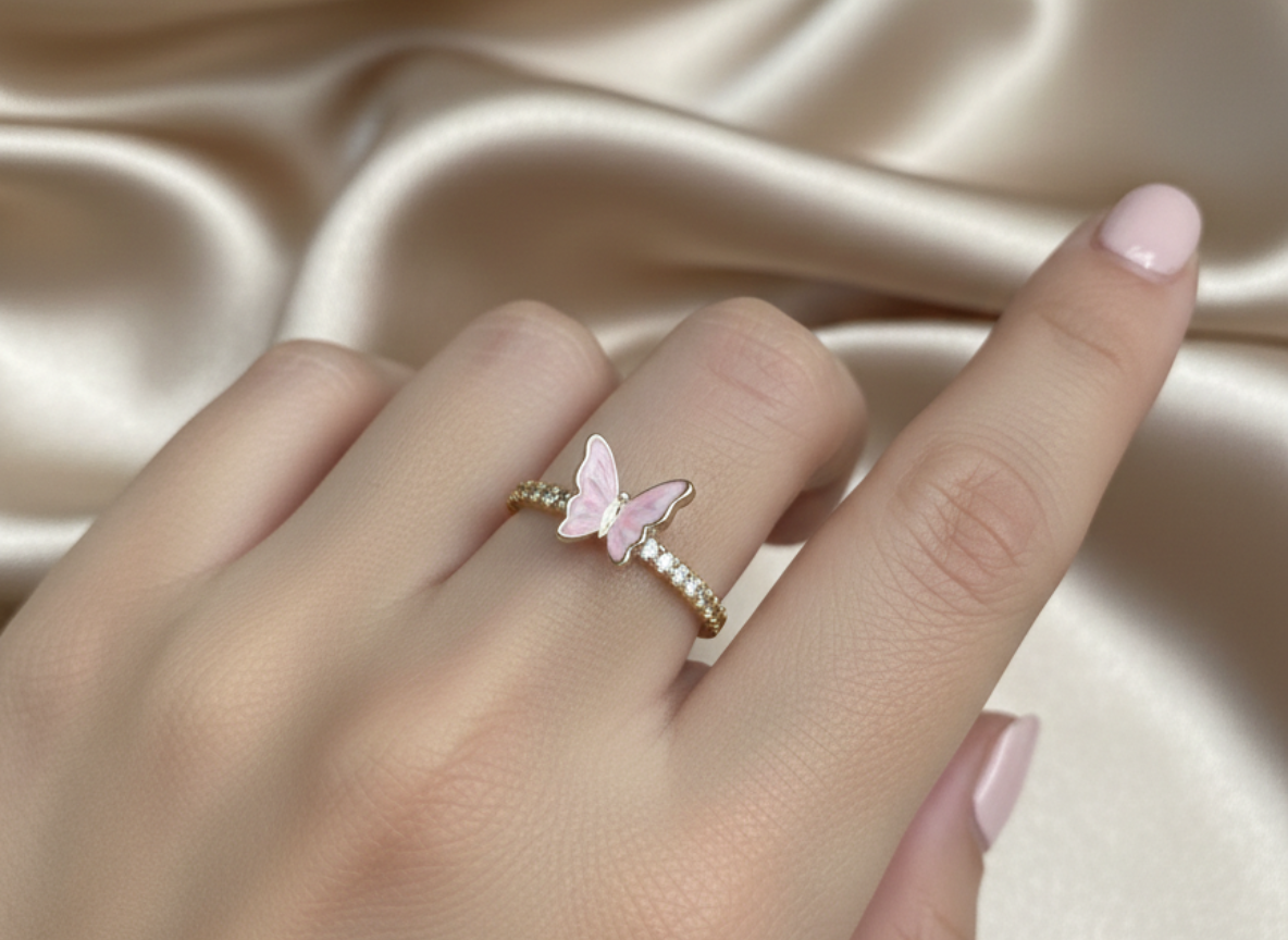 Graceful and enchanting, the Blush Butterfly Crystal Ring captures delicate beauty in every detail. Featuring a soft pink enamel butterfly centerpiece, this ring symbolizes transformation, elegance, and femininity.