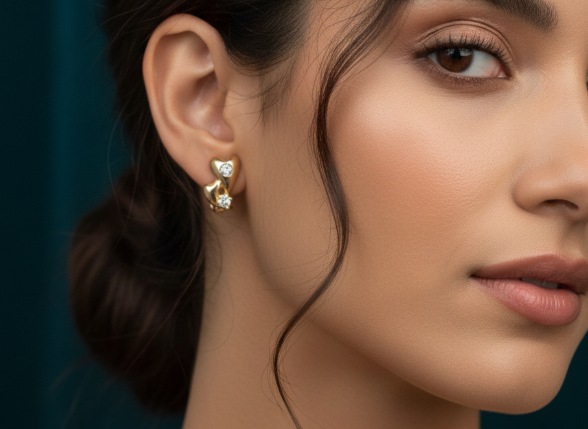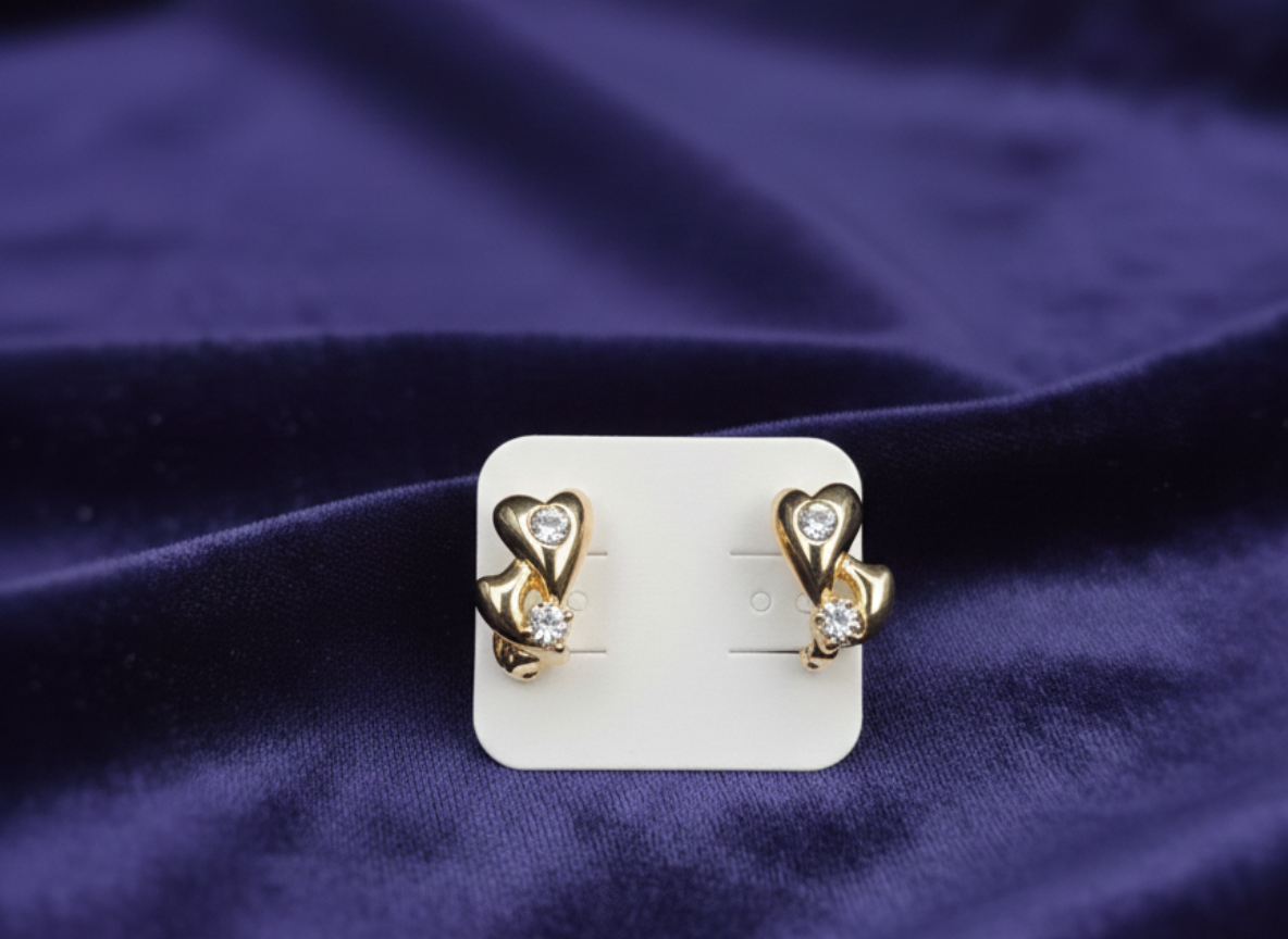 These beautifully crafted stud earrings feature a layered heart-inspired design in a polished gold finish. Each earring is adorned with two sparkling round stones—one delicately set within the upper heart and another accent stone below—adding depth and brilliance. The smooth curves and clean lines enhance the overall elegance, making them suitable for both everyday wear and special occasions.