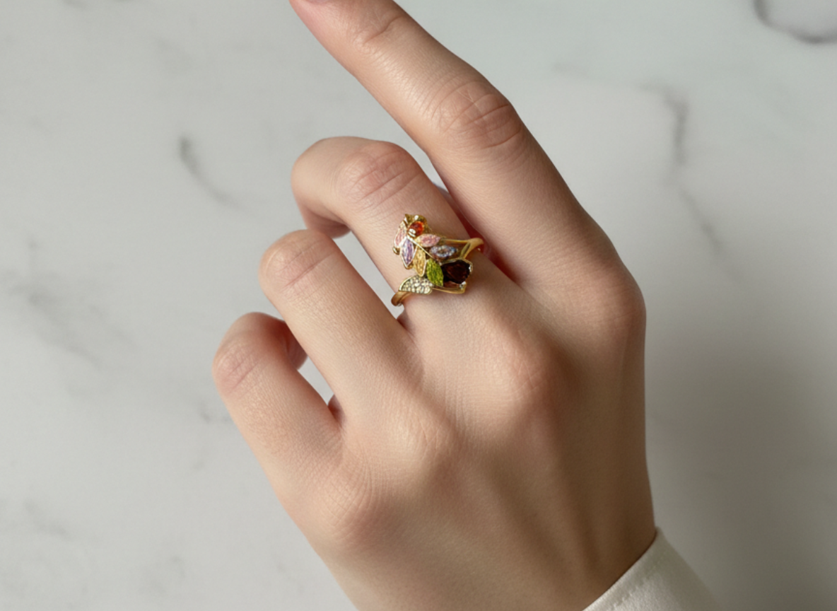 Bold, artistic, and full of charm — the Enchanted Garden Statement Ring is a true wearable masterpiece. Designed with intricate floral and butterfly-inspired elements, this ring features vibrant enamel detailing in soft pinks, greens, and warm amber tones, beautifully set against a radiant gold-tone base.