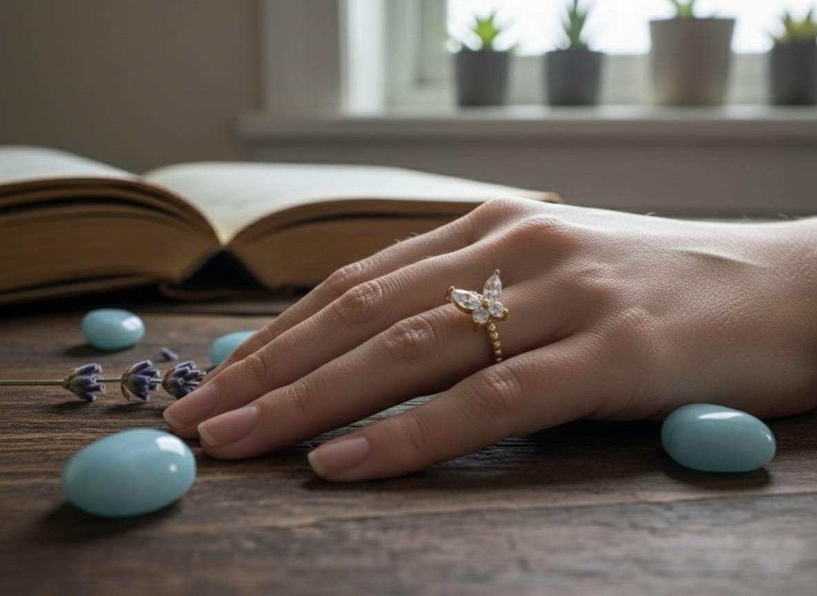 Beautiful gold-tone adjustable ring featuring a sparkling butterfly design with crystal stones. Perfect for daily wear and special occasions.