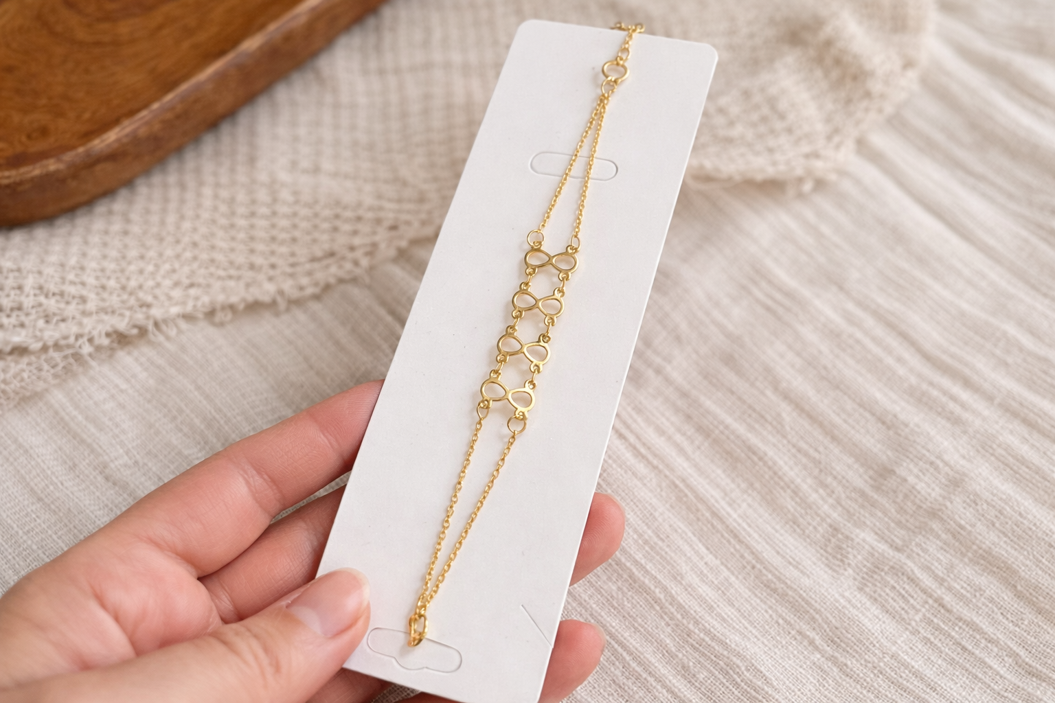 Delicate, refined, and effortlessly elegant — this gold-tone chain bracelet features a cascading row of infinity-inspired motifs that symbolize eternal love and timeless beauty. The airy openwork design creates a light, graceful look while maintaining a polished and luxurious finish.