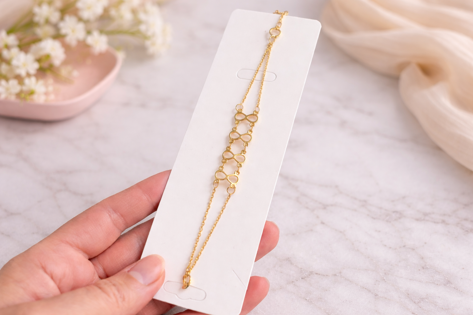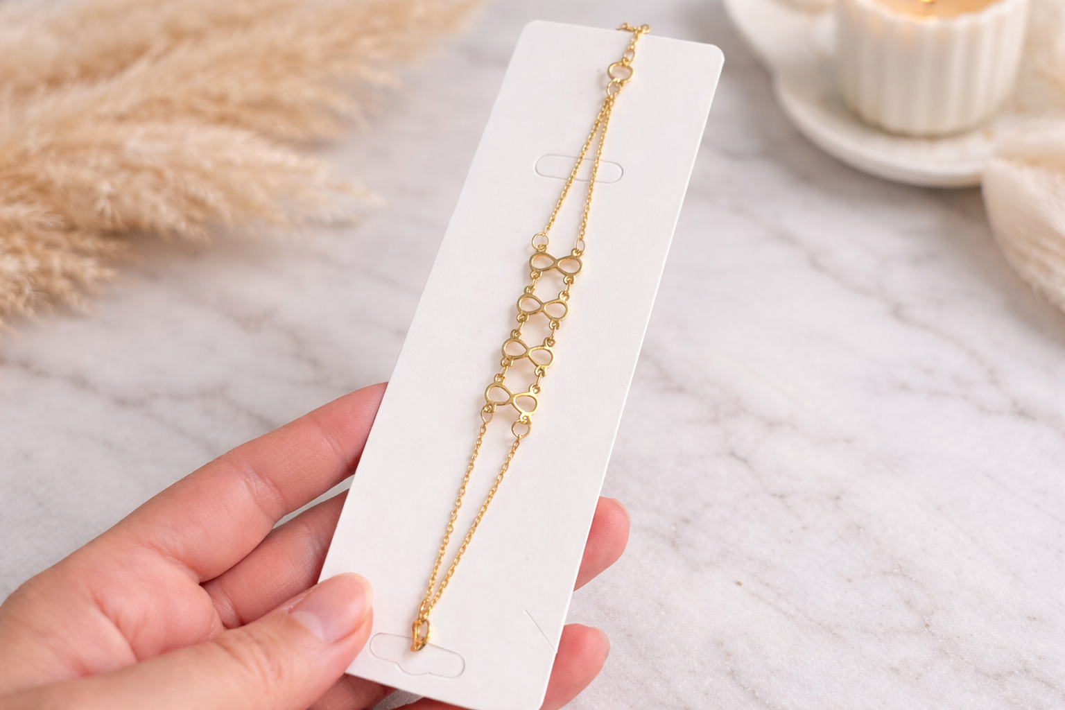 Crafted with a fine double-chain structure, the bracelet offers both stability and sophistication. The adjustable clasp ensures a comfortable and secure fit, making it perfect for daily wear or special occasions.