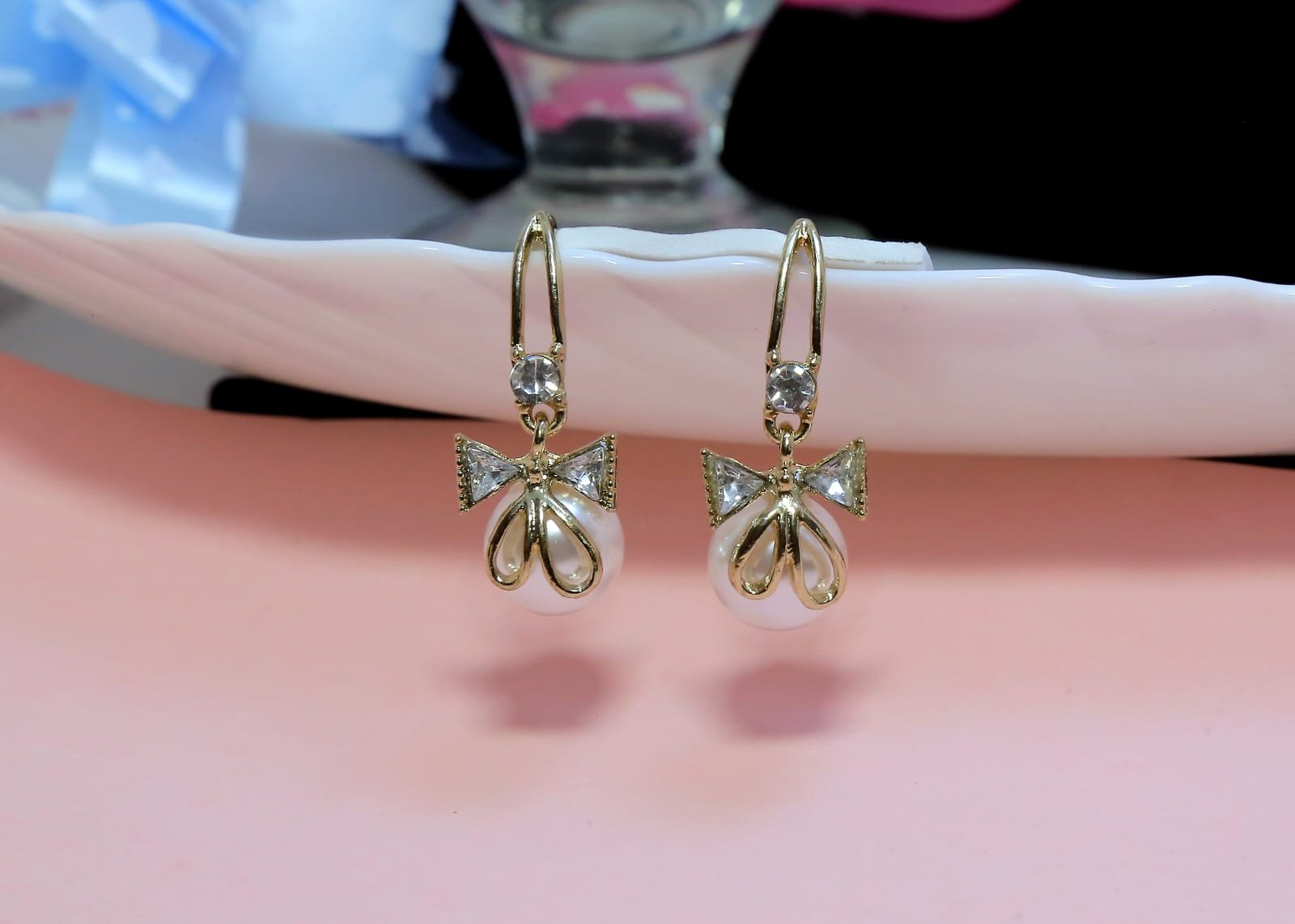These gold bow pearl drop earrings combine chic style and timeless elegance in a delicate design. The earrings showcase a polished gold-tone metal bow from which a lustrous pearl drop gracefully hangs. The bow detail adds a playful yet refined touch, while the pearl brings softness and sophistication to any outfit. Lightweight and comfortable to wear, these earrings are an ideal choice for everyday style or special events like parties, weddings, and celebrations. They also make a thoughtful and charming gift for birthdays, anniversaries, or festivals.
