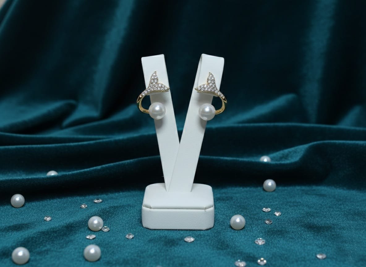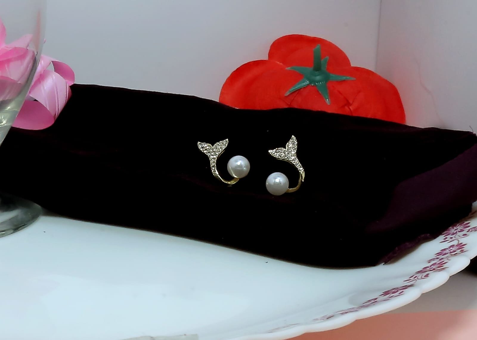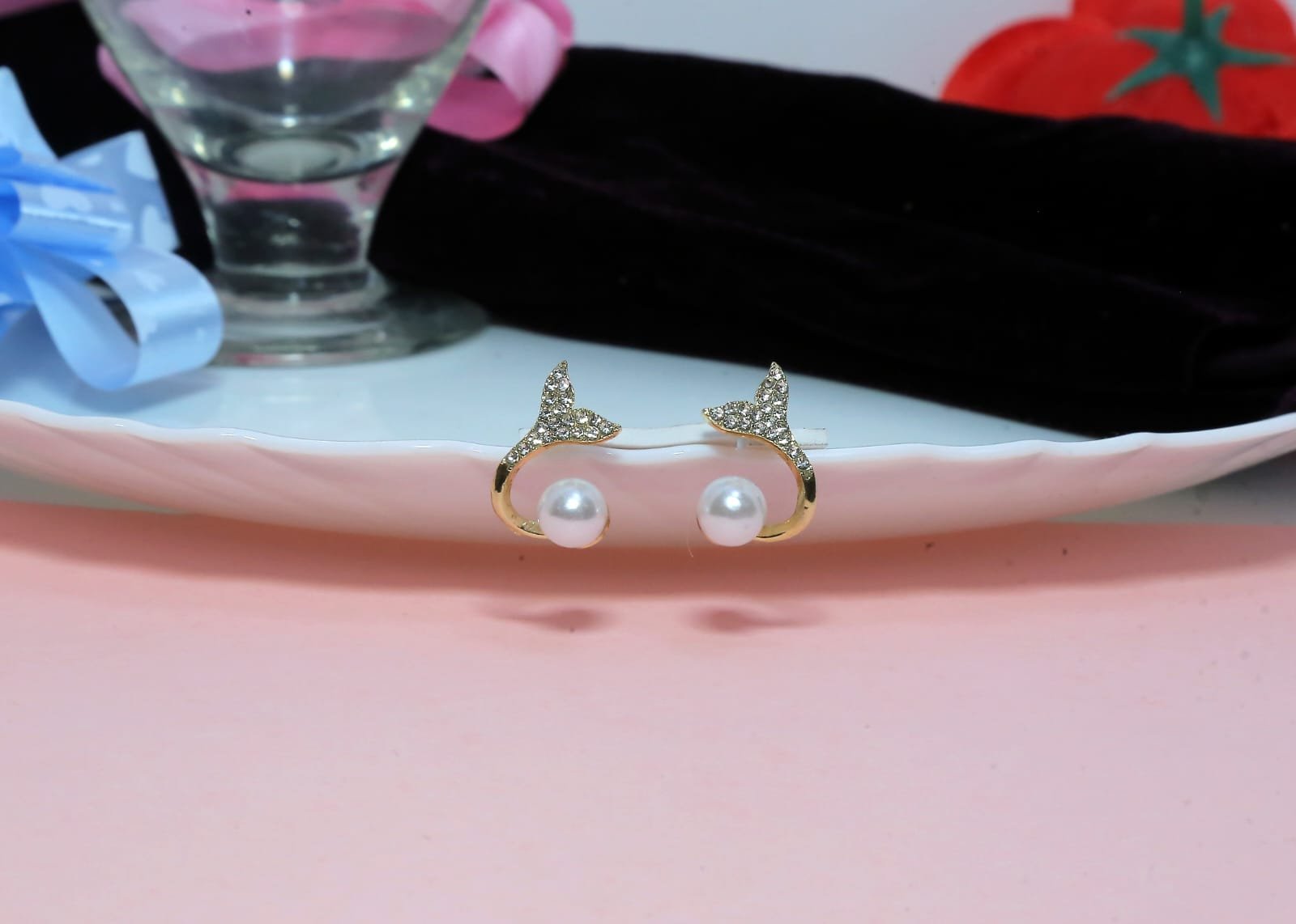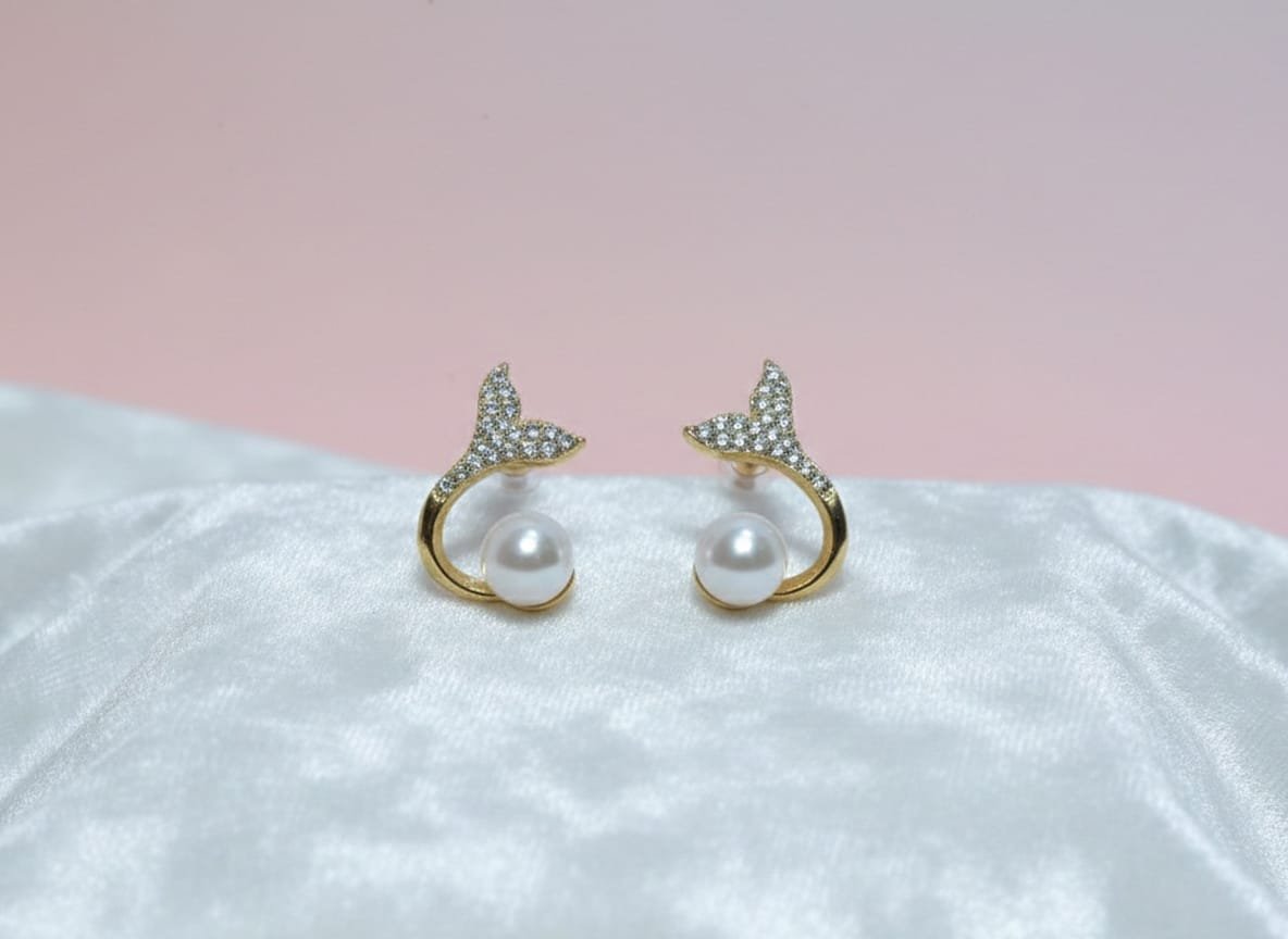 These pearl mermaid stud earrings bring a playful yet elegant twist to your accessories collection. The design showcases a graceful mermaid-tail shape adorned with shimmering accents, finished with a radiant pearl that adds charm and sophistication. The polished gold-tone metal gives these studs a subtle glow that pairs beautifully with both casual and dressier outfits.