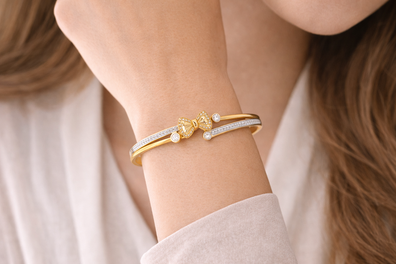 Add a touch of charm and sparkle to your jewelry collection with this beautifully designed bow crystal bracelet. Crafted in a premium gold-tone finish, this bracelet features a delicate bow motif at the center, symbolizing grace and femininity.