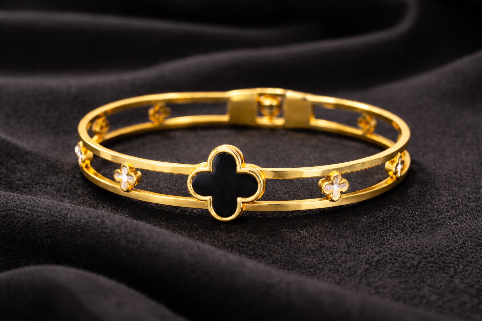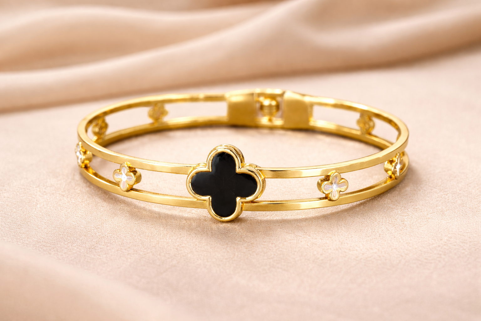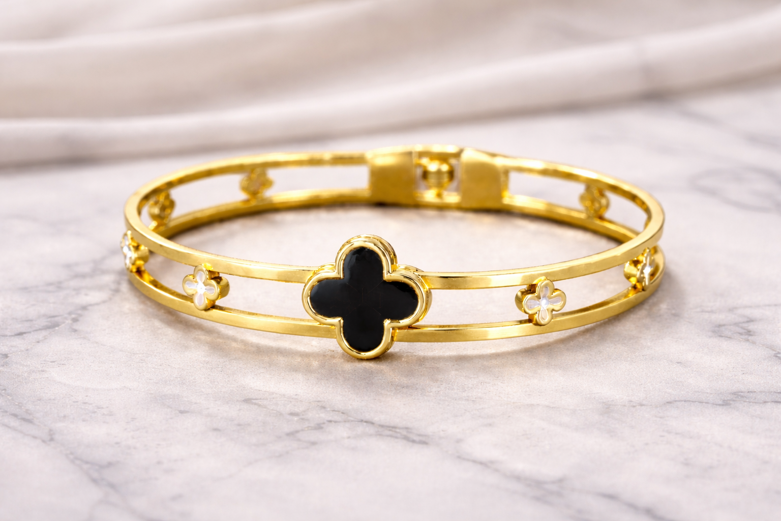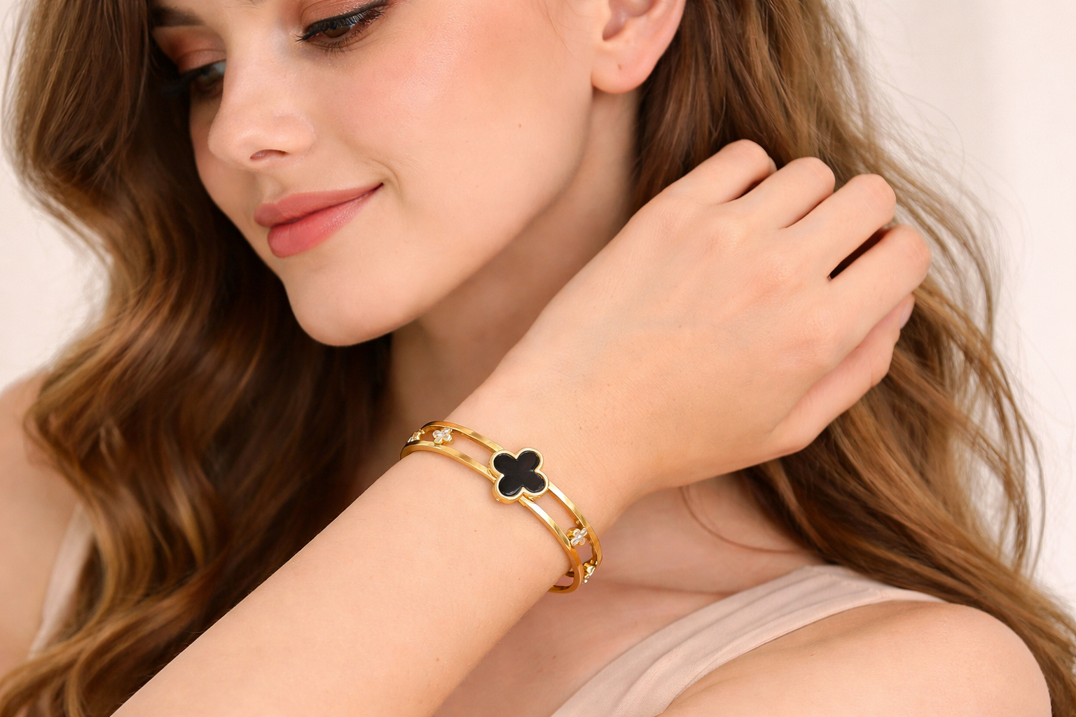 The structured yet lightweight design ensures comfortable wear while making a sophisticated statement. Perfect for both casual chic styling and evening glamour, this bracelet effortlessly elevates any look with its timeless clover-inspired motif.