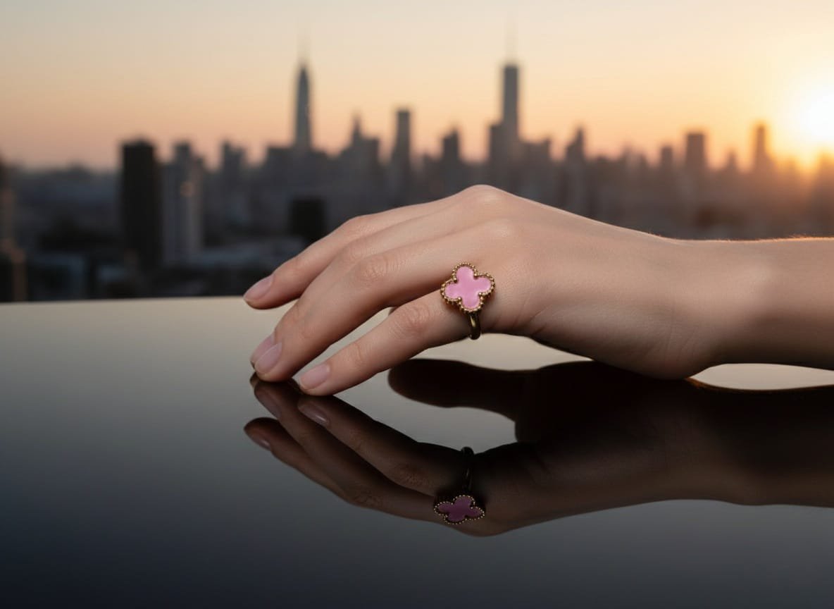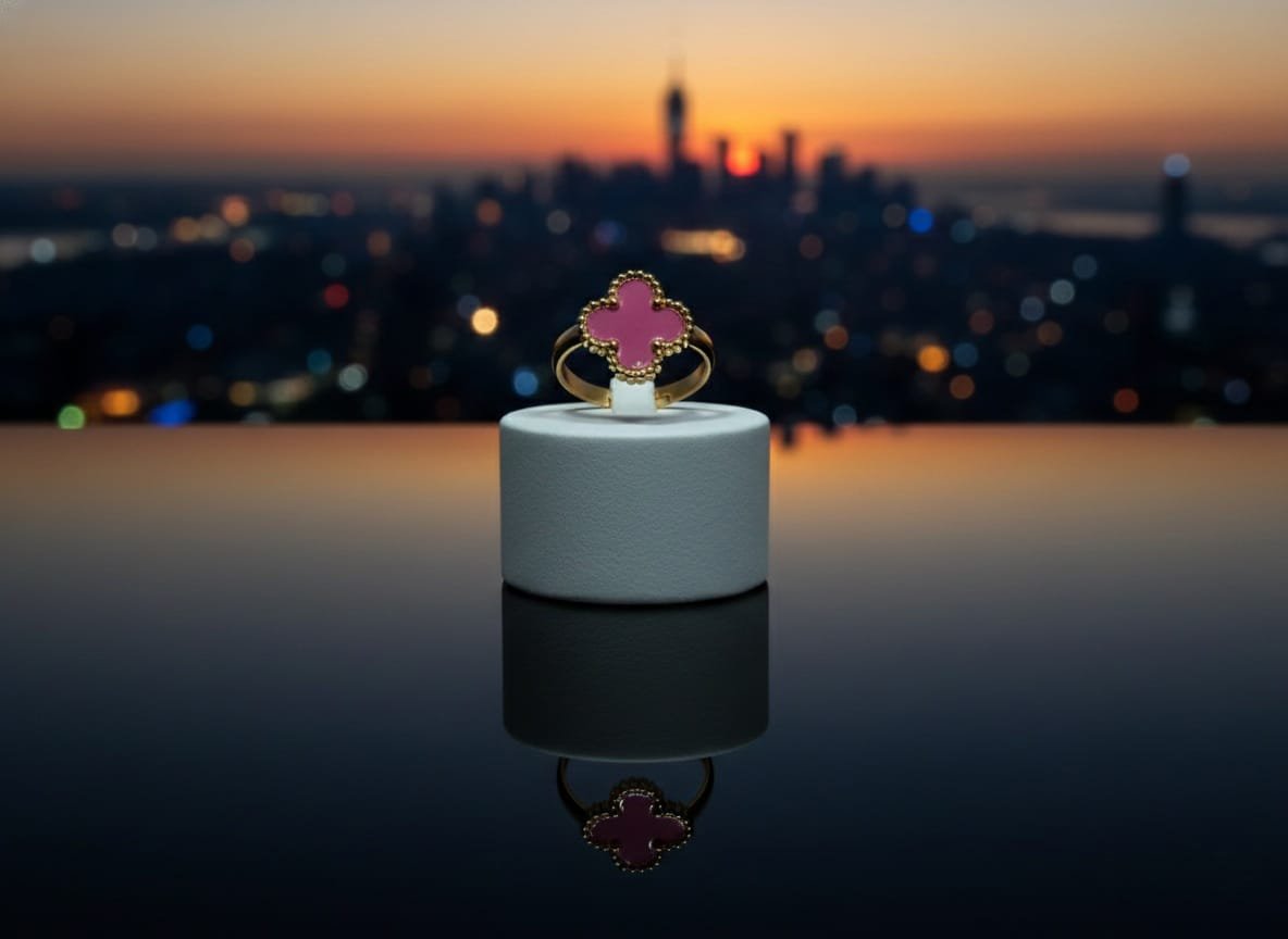Enhance your everyday style with this elegant pink clover ring. Featuring a delicate four-leaf clover design with a smooth pink enamel center and a refined gold-plated finish, this ring adds a graceful and feminine touch to any outfit.