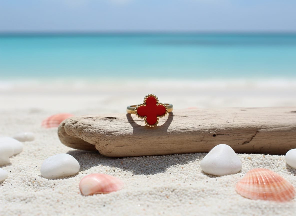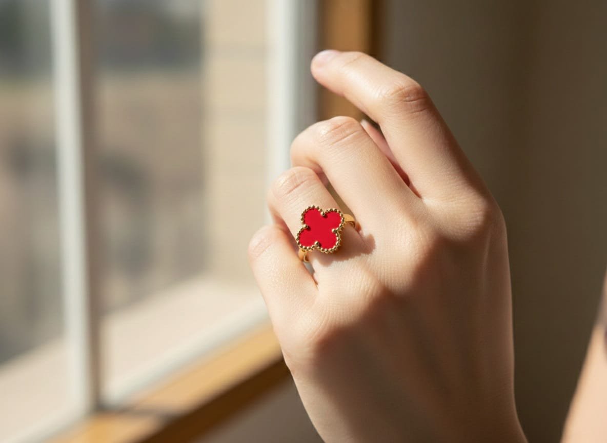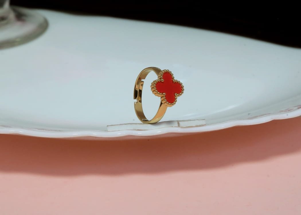 Beautiful gold-tone ring featuring a vibrant red clover design. Stylish, elegant, and perfect for daily wear or special occasions.