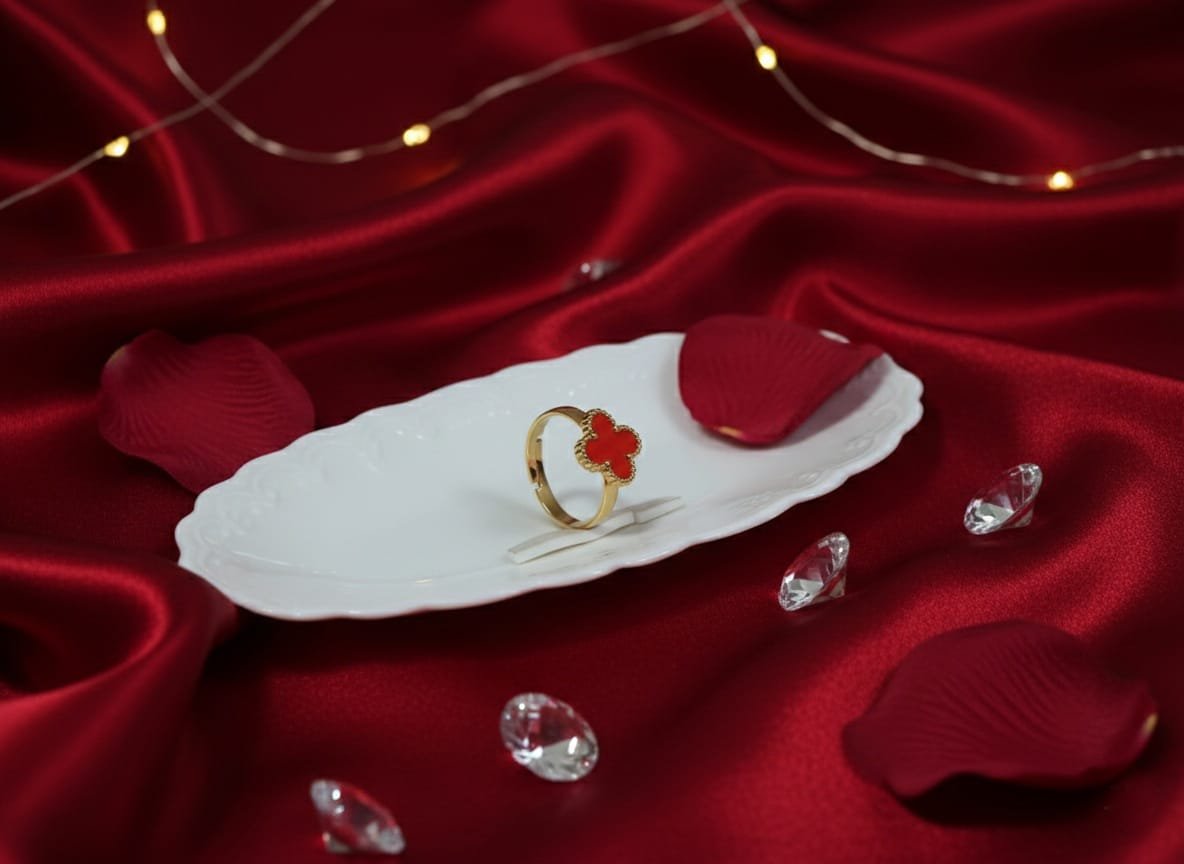 Enhance your jewelry collection with this stunning Red Clover Gold Ring. Designed with a bold four-leaf clover motif in a glossy red enamel finish, this ring symbolizes charm, luck, and elegance.